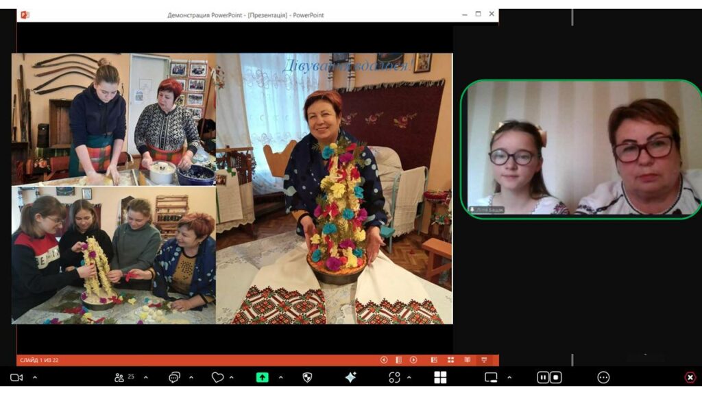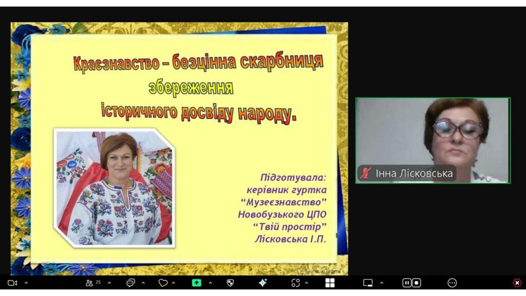 Характерними рисами й основними напрямами роботи музею при закладі позашкільної освіти поділилась Лісковська Інна Петрівна, методист Центру позашкільної освіти «Твій простір» Новобузької міської ради, керівник Історичного музею освіти. Учасники Семінару отримали можливість онлайн екскурсії двома експозиціями, представленими в музеї – історичною та етнографічною. Інна Петрівна також познайомила присутніх з власним досвідом використання експонатів етнографічної експозиції для проведення занять у гуртках та різних масових заходів народознавчого спрямування, що проводить позашкільний заклад.