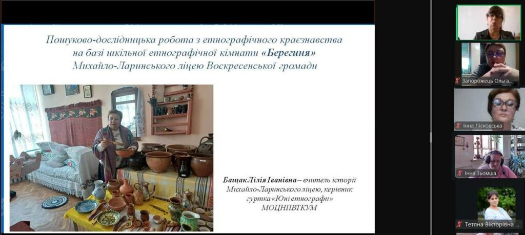 Бащак Лілія Іванівна, вчитель історії Михайло-Ларинського ліцею Воскресенської селищної ради розповіла про особливості організації пошуково-дослідницької роботи з етнографічного краєзнавства на базі шкільної етнографічної кімнати «Берегиня». Співдоповідачами виступали вихованці Лілії Іванівни, які представили як вже реалізовані проєкти, так і ті, робота над якими ще продовжується. Доповідачі переконливо довели, що польові дослідження є одним з ключових джерел поповнення колекції експонатів музею предметами побуту та сільськогосподарського реманенту, а використання усного методу дозволяє зібрати рецепти вже забутих страв та випічки. Це дає можливість юним музеєзнавцям-етнографам на заняттях разом з керівником оживляти експонати, відтворювати атмосферу сільського життя рідного краю у середині ХХ століття. Підсумовуючи свій виступ педагог зазначила, що Михайло-Ларинська шкільна етнографічна кімната «Берегиня» – це простір, де оживає історія, де традиції стають частиною сучасного освітнього процесу.